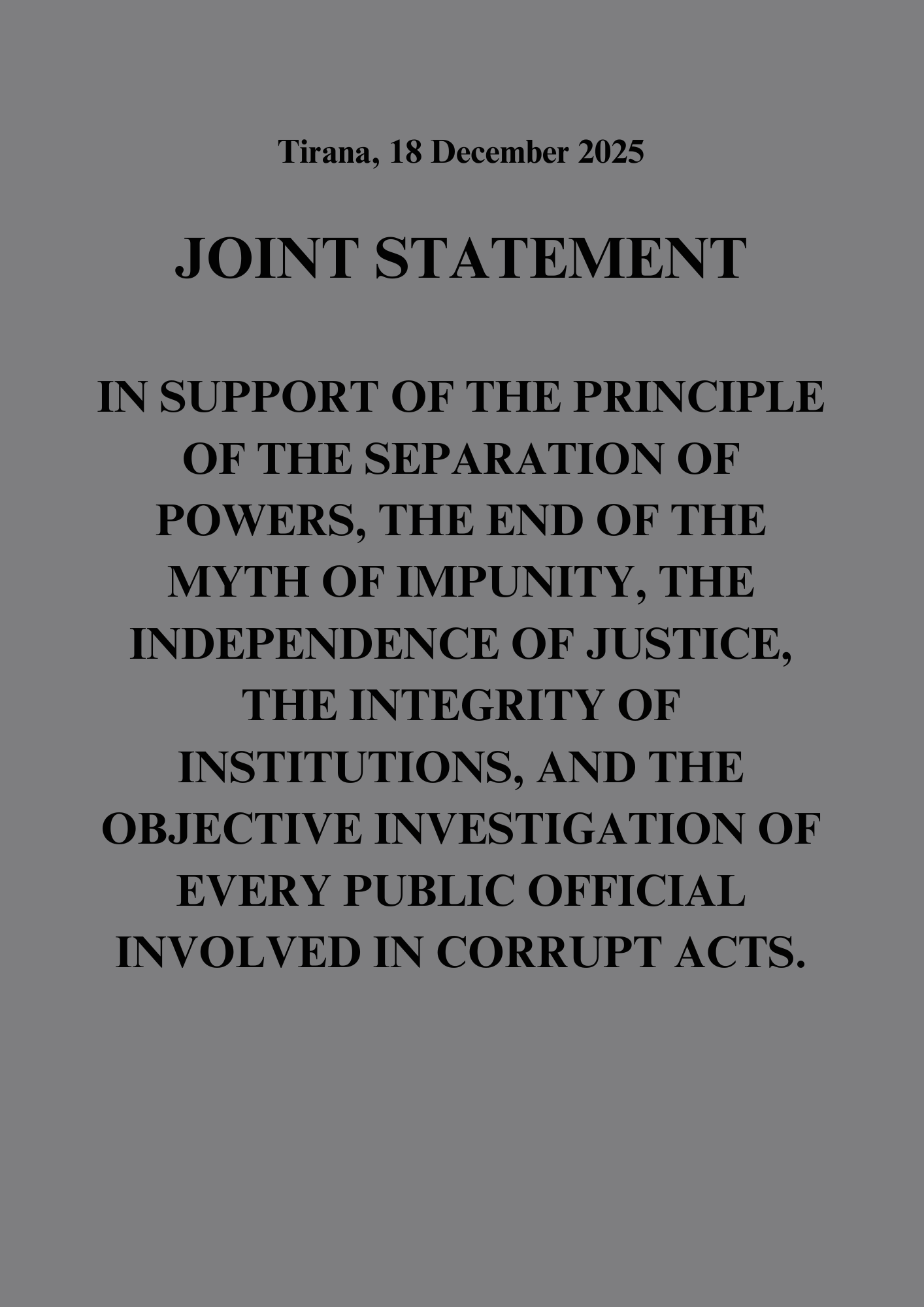 - We express concern about the departure from the territory of the country of individuals who are under investigation by SPAK and ask the State Police to make transparent the conditions and circumstances in which these citizens departed, escaping investigation and a close encounter with justice, whether for these citizens there were measures to forbid their exit from the territory or measures of personal security. This is not the only precedent in a country where the force of the law and effective coordination among authorities should operate.